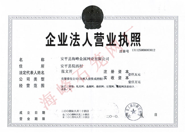 安平縣海峰金屬網業有限公司 安平縣海峰金屬網業有限公司位于中國著名的“絲網之鄉”——河北省安平縣,是具有拉絲織網、焊接、剪裁、噴塑、浸塑成品等一整套生產工藝的專業化廠家。本公司經過多年來的順勢發展,現已擁有廣闊的生產廠房和優良的辦公環境,占地8500平方米,在廠職工100余人。擁有高深的技術人員,高端的生產設備,全自動的機械化生產流水線,站在了軋花網、石籠網同行業的頂端。